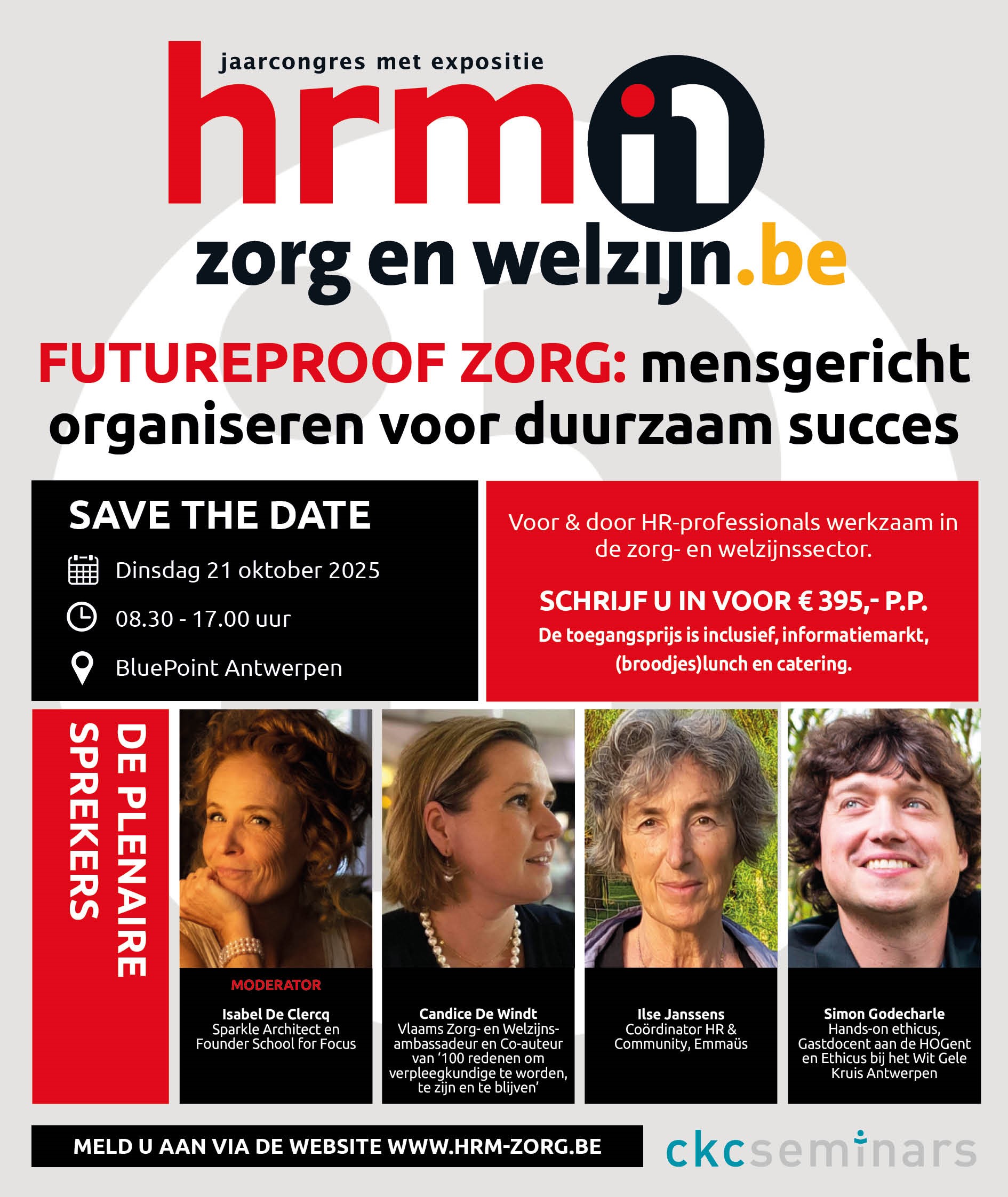 Op dinsdag 21 oktober vindt het jaarcongres HRM in de Zorg plaats in congrescentrum BluePoint Antwerpen. Met als thema dit jaar: Futureproof zorg: mensgericht organiseren voor duurzaam succes.